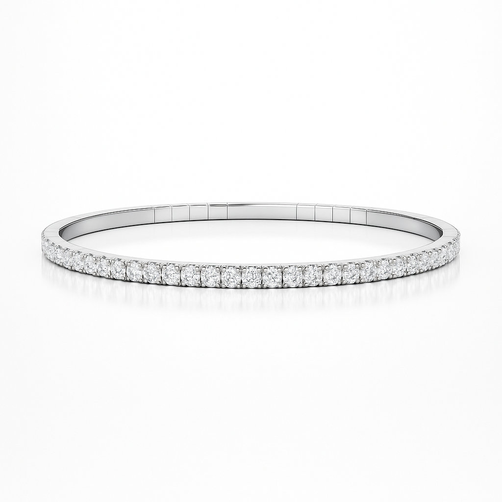 This delicate POOKIE Open Flex Floral Bangle sparkles with blue sapphire & round diamond, set in sleek 14K White Gold (Custom Select). Lightweight yet luxurious, it’s a piece you’ll reach for again and again.