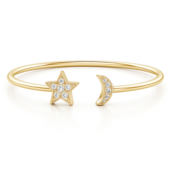 This delicate POOKIE Star and Moon Flex Bangle sparkles with blue sapphire & round diamond, set in sleek 14K Yellow Gold (Custom Select). Lightweight yet luxurious, it’s a piece you’ll reach for again and again.